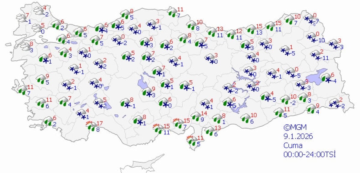 Cuma günü ise Edirne ile Kırklareli çevreleri hariç yurdun tamamında yağış beklendiğini söyleyen Çelik, “Yağışlar çoğunlukla yağmur ve sağanak şeklinde ancak iç kesimlerde rakımı yüksek bölgelerde karla karışık yağmur şeklinde görülecek” diye konuştu.