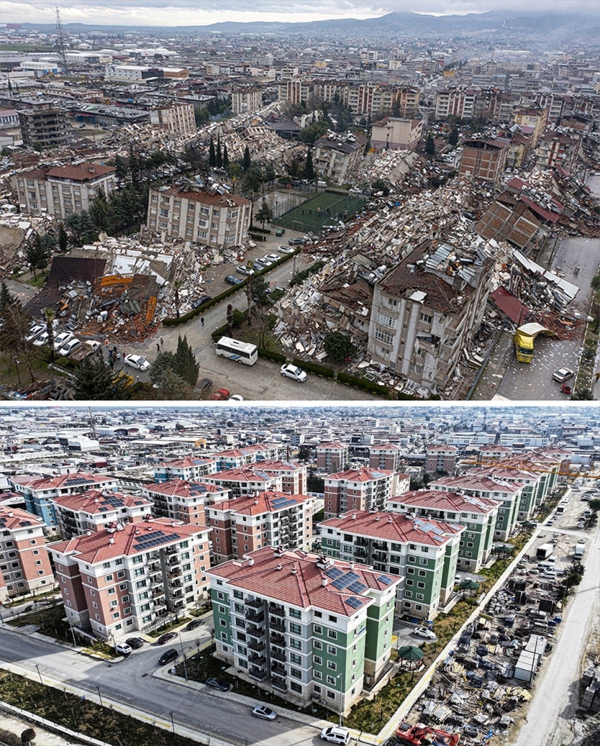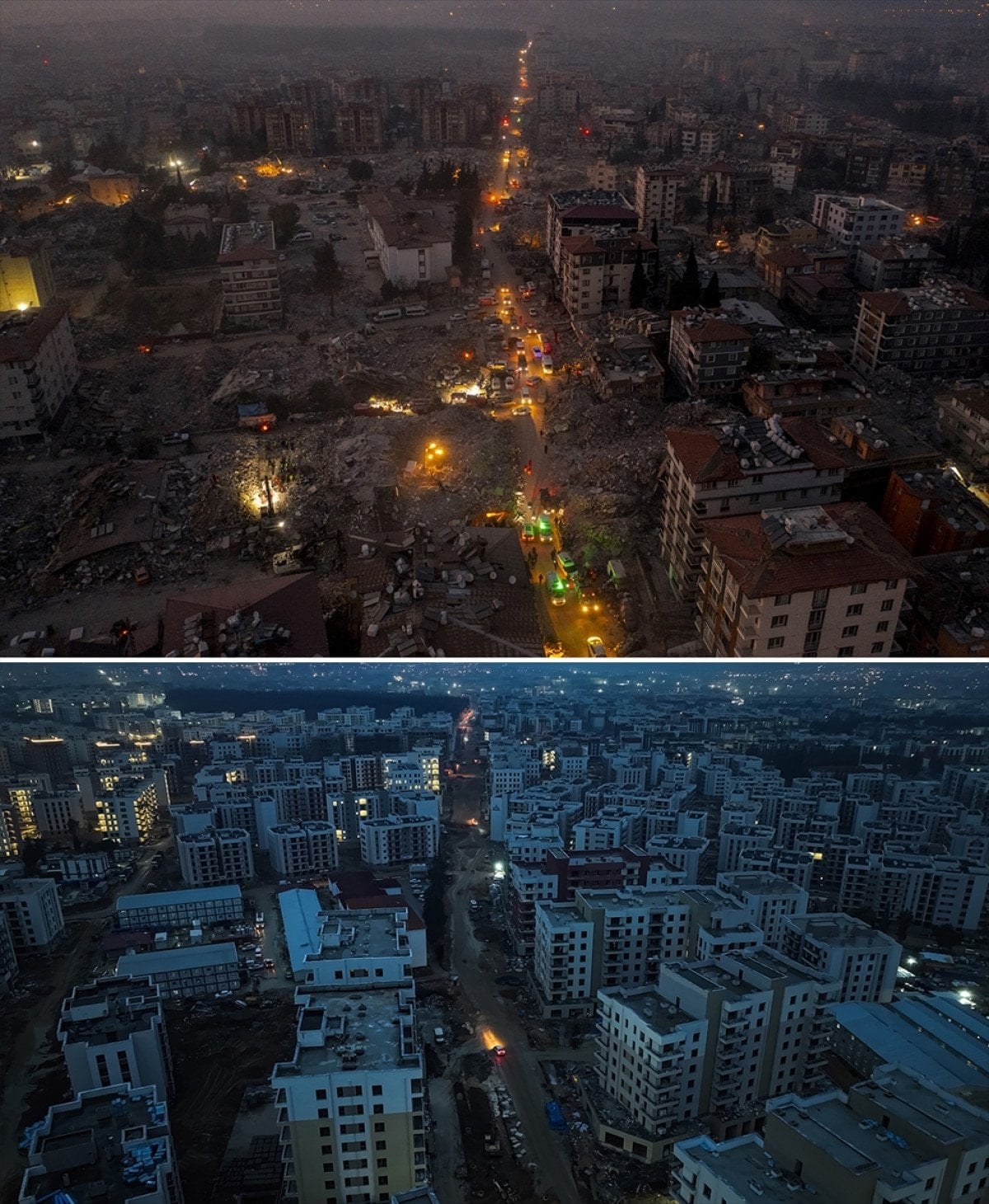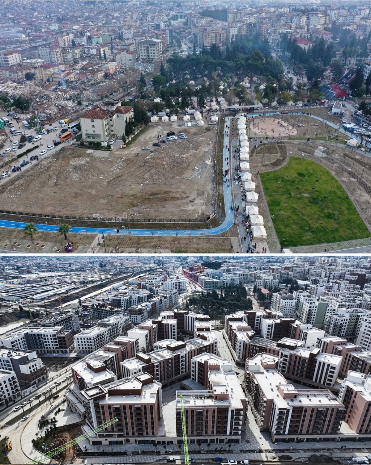 Ortaya çıkan kareler, 2023’te enkaz haline gelen alanların yerinde yükselen yeni yapıları ve şehir genelinde yürütülen kapsamlı inşa çalışmalarını ortaya koydu.