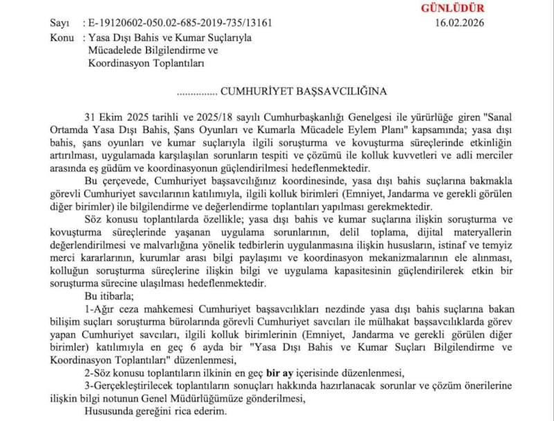 Adalet Bakanı Akın Gürlek, yasa dışı bahis ve sanal kumar konularında mücadeleyi güçlendirmek için her ilde en geç 6 ayda bir “Bilgilendirme ve Koordinasyon Toplantısı” düzenlenmesini istedi. Toplantılara, ilgili ilde görevli bilişim suçları savcılarının yanı sıra Emniyet ve Jandarma birimleri katılacak.
