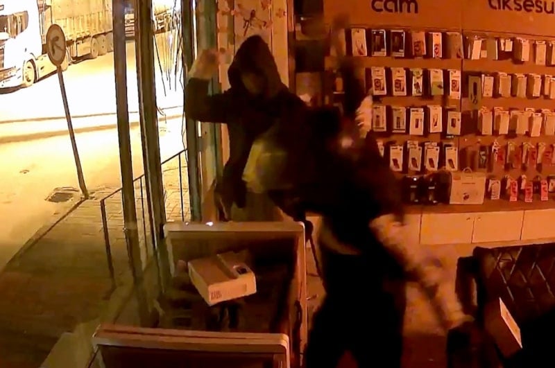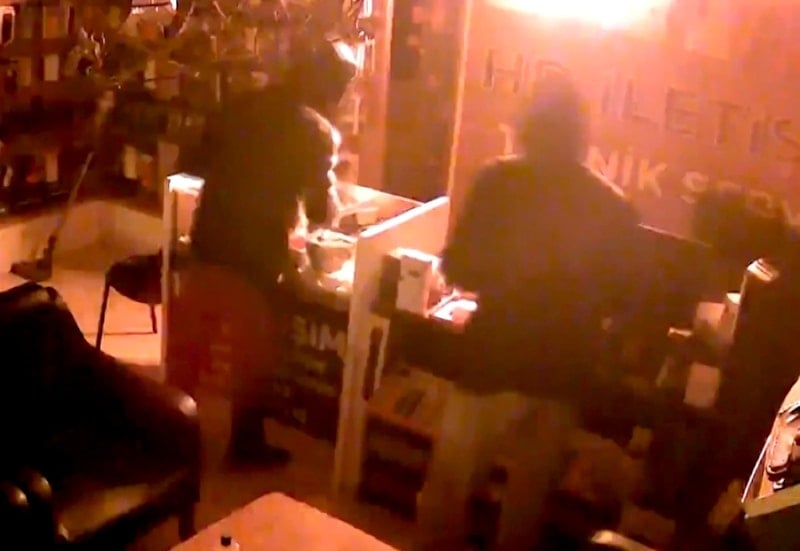 Yüzlerini kapüşon ve motosiklet kaskıyla gizleyen Serhat Can Z. ile A.A., Halil İbrahim D.’nin iş yerinin camını kaldırım taşıyla kırarak içeri girdi.
