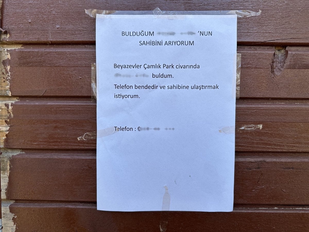 Cihazı kontrol eden Almaz, telefonun şarjının bittiğini fark edince sahibine ulaşabilmek için parkın çeşitli noktalarına, telefon bulduğunu ve sahibini aradığını belirten A4 kağıdına basılı yazılar astı.