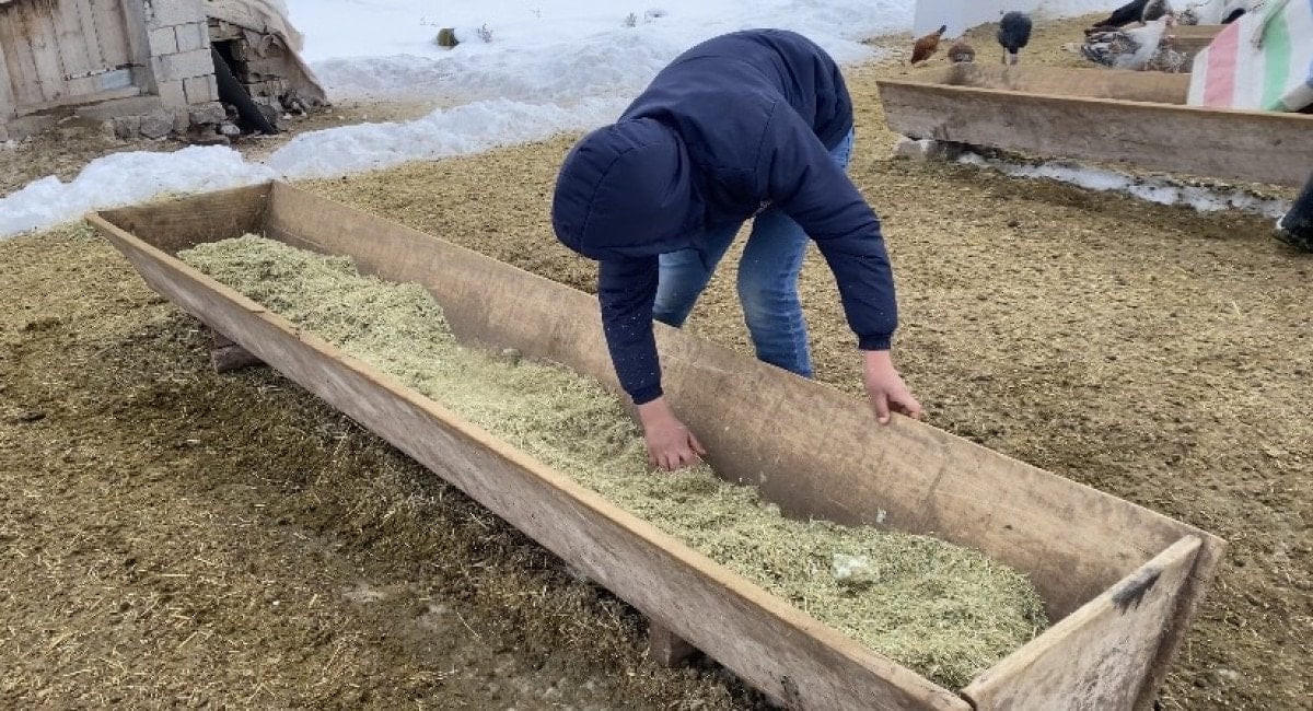 Bu yıl yoğun bir kar yağdığını ifade eden Menekşe Sevinç, “Koyunlara ot vermek için alanı kardan temizliyorum. Bu sene kar yoğun bir şekilde yağdı. Biraz fazla eziyet çektik ama değdi. Günde 2 kez hayvanları dışarı çıkartıp yem veriyoruz. Zor olsa da bunu yapmak zorundayız” dedi.