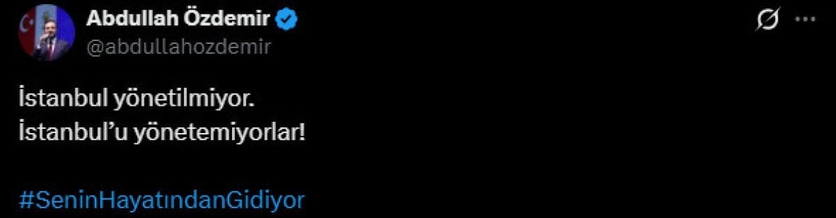 AK Parti İstanbul İl Başkanı Abdullah Özdemir de konuya ilişkin, “İstanbul yönetilmiyor. İstanbul’u yönetemiyorlar. Senin hayatından gidiyor” paylaşımında bulundu.