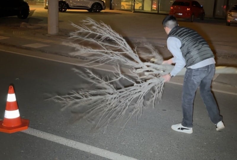 Öte yandan kaza nedeniyle cam ve plastik parçalarla dolu olan yolu, yoldan geçen ve eczacı olduğu öğrenilen Burak Yüksel isimli bir genç kırılan ağacı süpürge gibi kullanıp diğer araçların zarar görmemesi için temizledi. O anlar kameraya yansıdı.