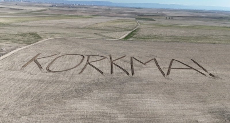 Aksaraylı çiftçiden 12 Mart’a özel mesaj: Tarlasına ‘Korkma’ yazıdırdı