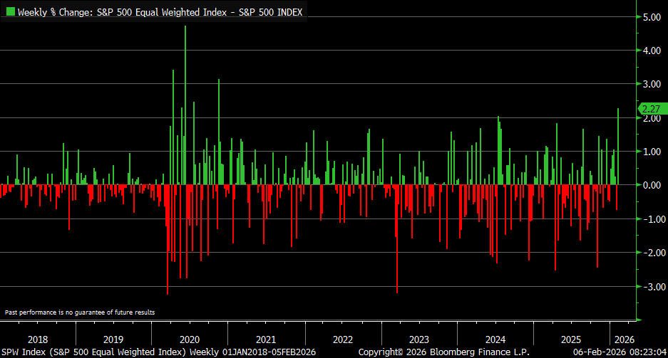 İkinci grafik, piyasanın genişliğini ölçen kritik bir soruya odaklanıyor: “Yükseliş kaç hisseyle taşınıyor?” Burada haftalık bazda, S&P 500 eşit ağırlık endeksinin getirisi ile klasik S&P 500 endeksinin getirisi arasındaki fark gösteriliyor. Eşit ağırlık, büyük şirketleri küçüklerle aynı “oy gücünde” sayar. Klasik endeks ise piyasa değeri büyük olanları daha ağır tartar. Bu nedenle iki endeks arasındaki fark, yükselişin tabana yayılıp yayılmadığını anlamak için iyi bir göstergedir.