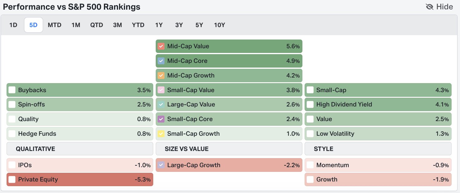 Üçüncü grafik, son 5 günlük dönemde farklı segment ve faktörlerin S&P 500’e göre nasıl performans verdiğini sıralayan bir tablo.