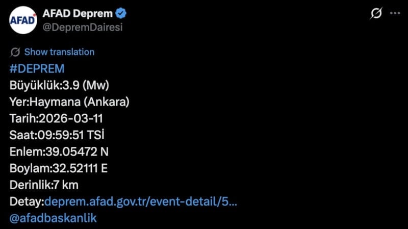 AFAD’ın paylaştığı son dakika bilgisine göre başkentte 3.9 büyüklüğünde bir deprem meydana geldi.