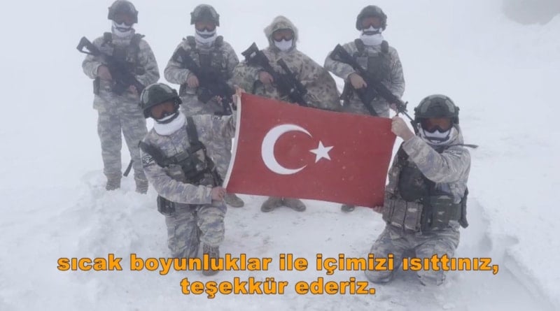 Paylaşımda, “Ankaralı Hatice Güner Hanımefendi’nin sevgiyle ördüğü, her ilmeğinde vatan sevgisi barındıran 195 adet el emeği boyunluk, zorlu kış şartlarında görev yapan kahramanlarımıza ulaştı.