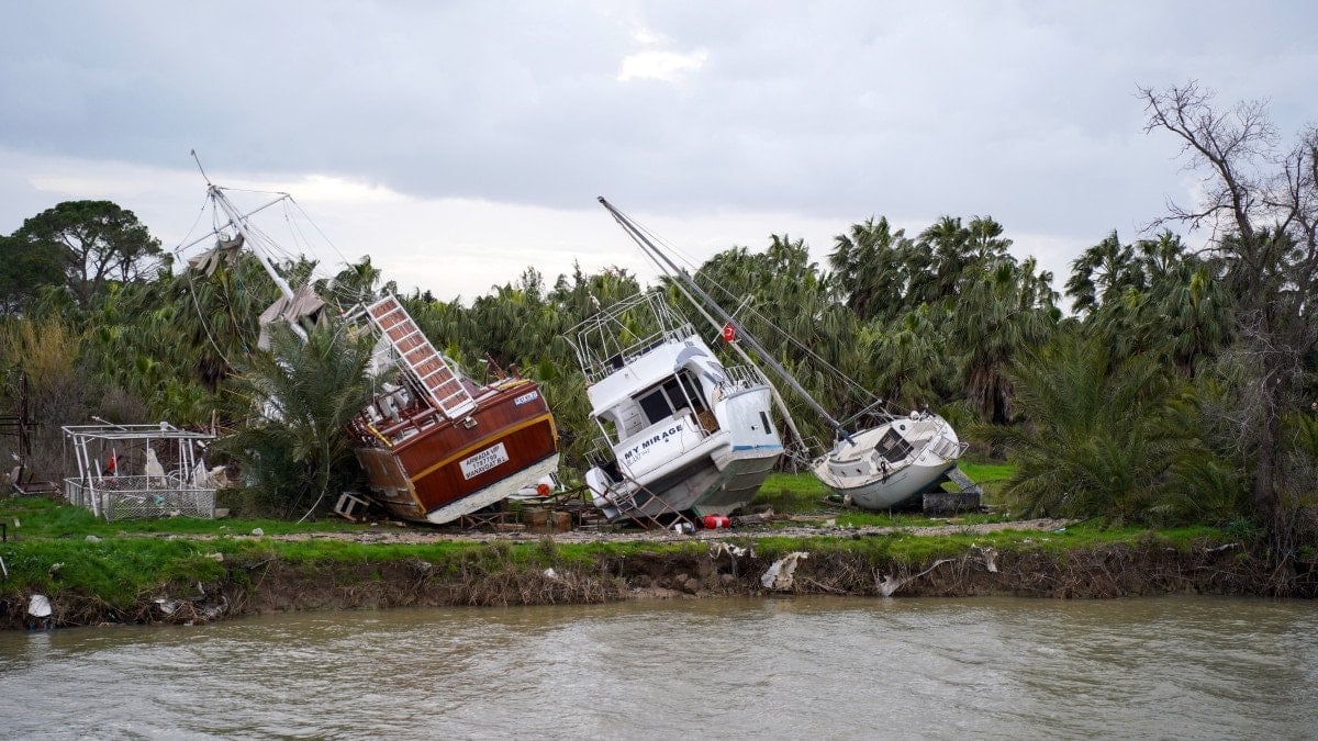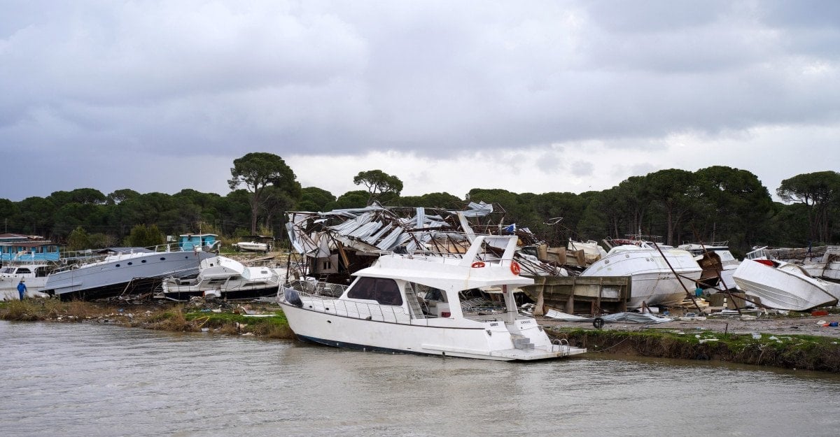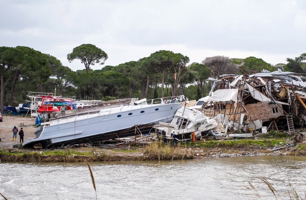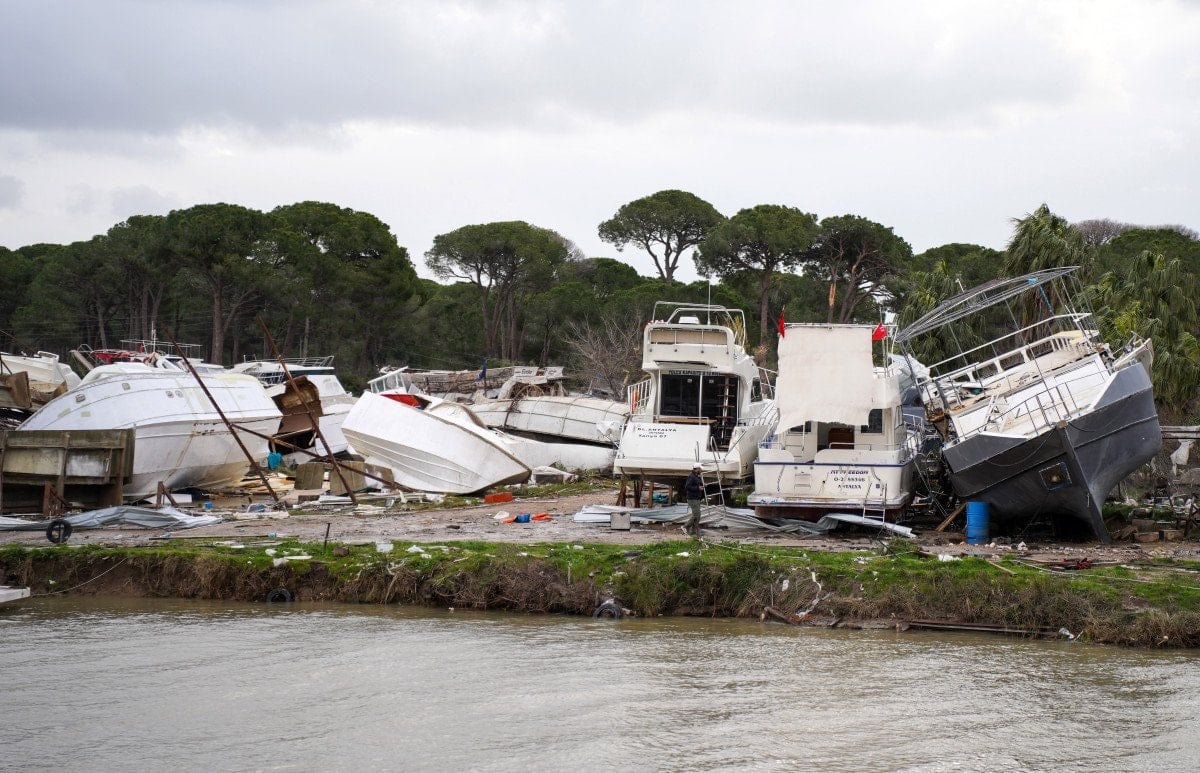 Bakım için karada bekleyen teknelerin bazıları da birbirleri üzerine devrildi.