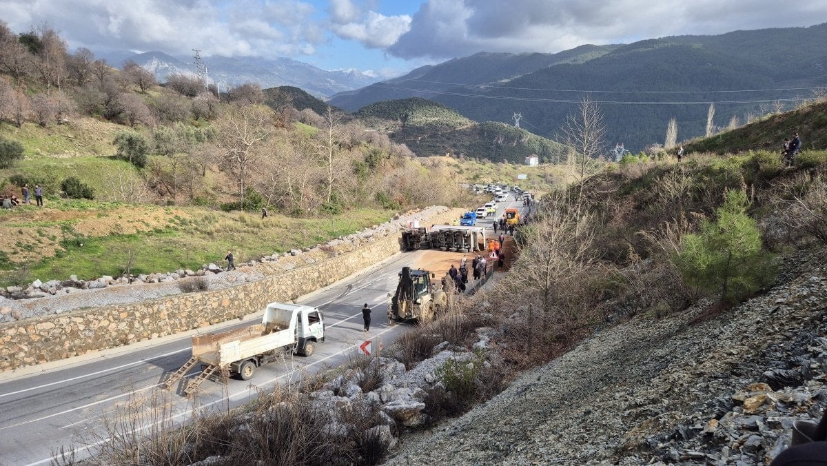 Antalya’nın Alanya ilçesinde sürücüsü belirlenemeyen kum yüklü kamyon, aynı güzergahtaki yine plakaları ve sürücüleri belirlenemeyen 2 otomobille çarpıştı.