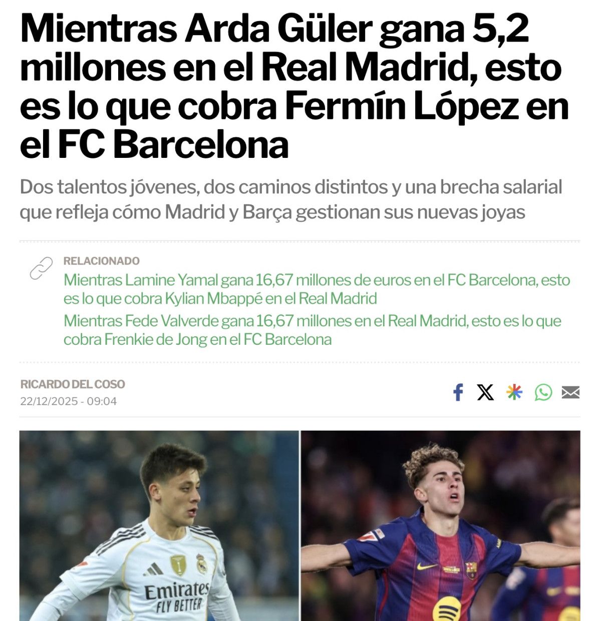 Xabi Alonso döneminin ardından Real Madrid’de önemli bir rol üstlenen ve başarılı bir sezon geçiren Arda Güler, bu kez performansıyla değil, kazancıyla Barcelona’nın genç yıldızı Fermin Lopez ile karşılaştırıldı.