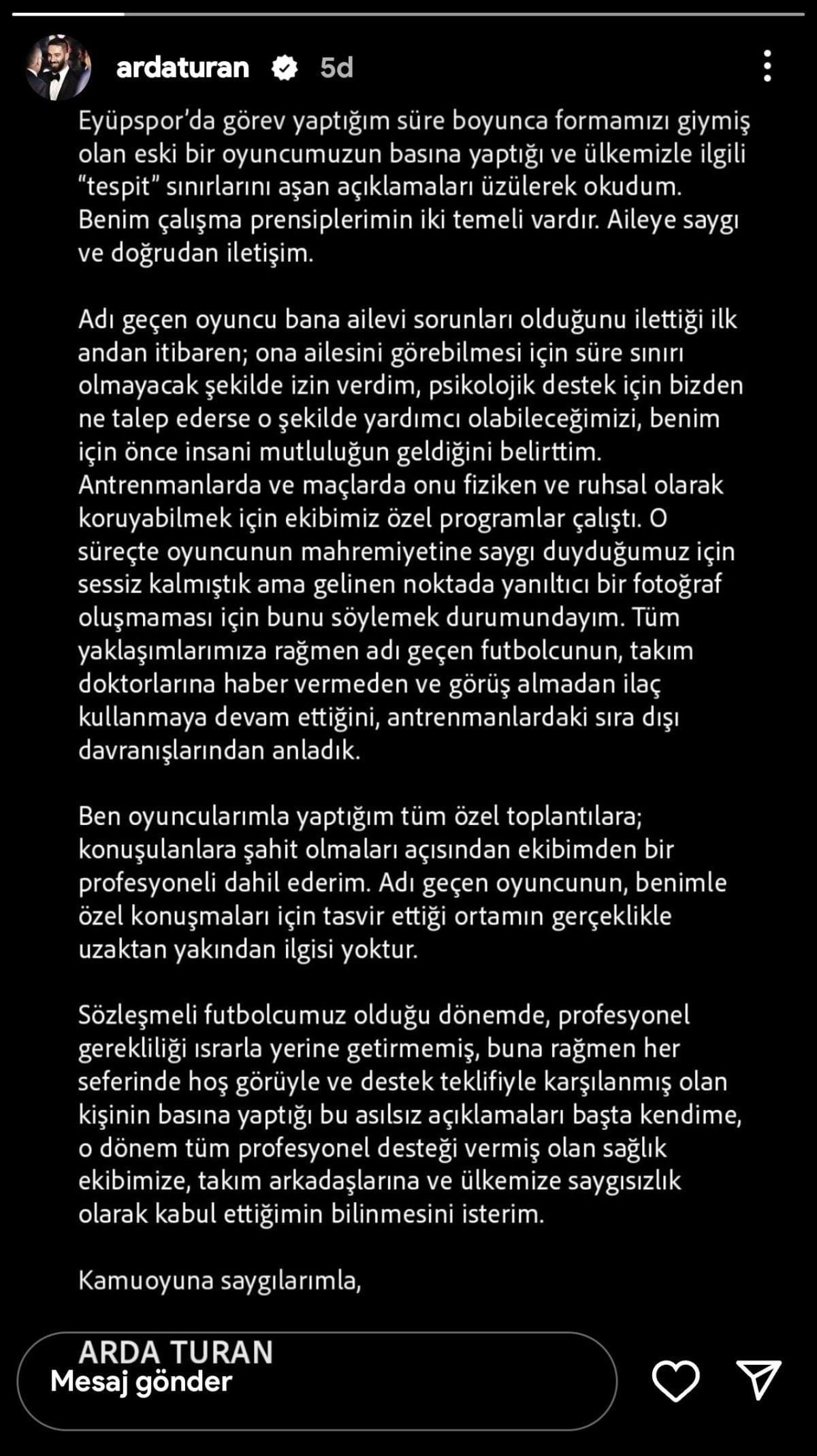 Sözleşmeli futbolcumuz olduğu dönemde, profesyonel gerekliliği ısrarla yerine getirmemiş, buna rağmen her seferinde hoş görüyle ve destek teklifiyle karşılanmış olan kişinin basına yaptığı bu asılsız açıklamaları başta kendime, o dönem tüm profesyonel desteği vermiş olan sağlık ekibimize, takım arkadaşlarına ve ülkemize saygısızlık olarak kabul ettiğimin bilinmesini isterim.