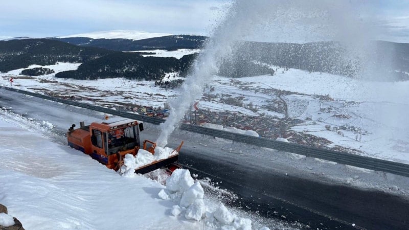 Karayolları 18’inci Bölge Müdürlüğüne bağlı 183’üncü Şube Şefliği ekipleri, kar kütlelerini rotatifle temizlerken, 2 greyder ve 2 kepçe de yolda çalışma yapıyor.