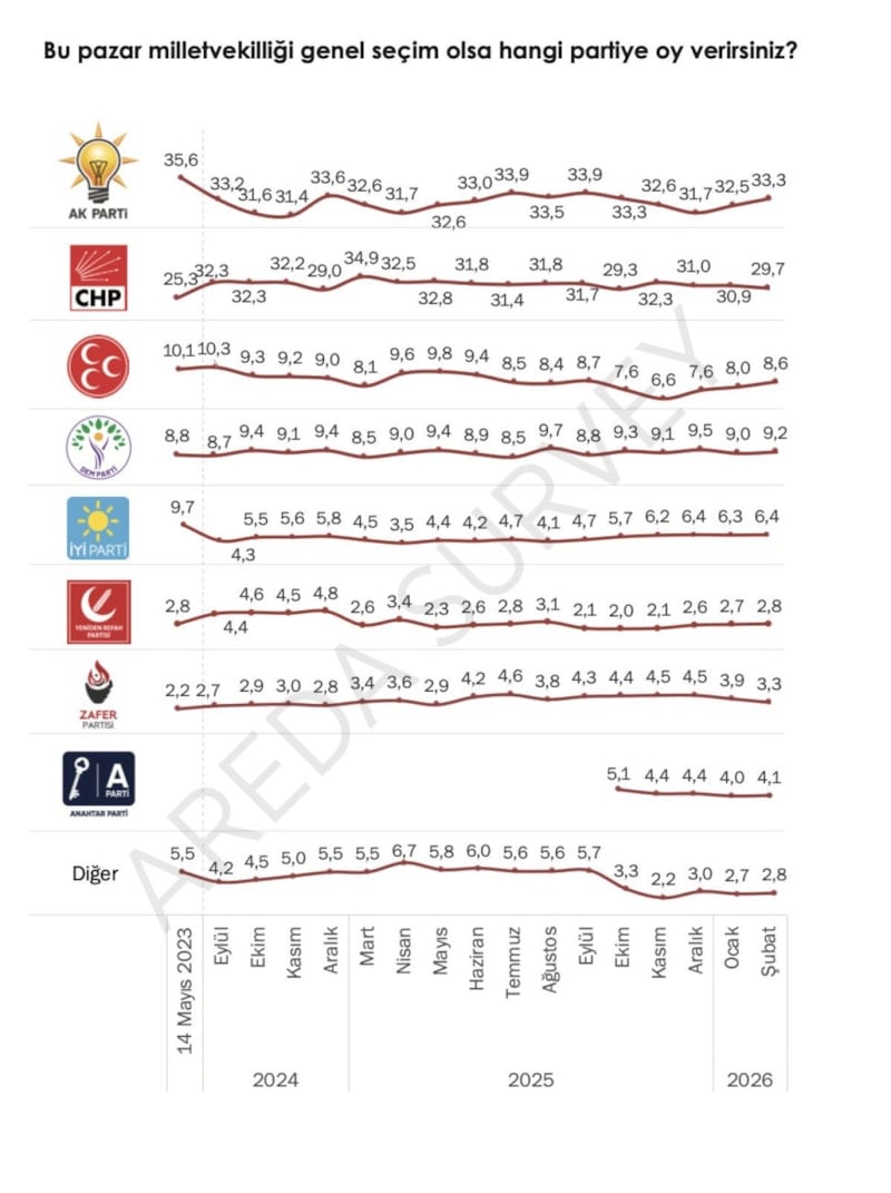 Areda Survey Araştırma Şirketi’nin “Bu pazar milletvekili genel seçimi olsa hangi partiye oy verirsiniz” başlıklı anketinde, son 3 yıldaki seçim eğilimi mercek altına alındı.