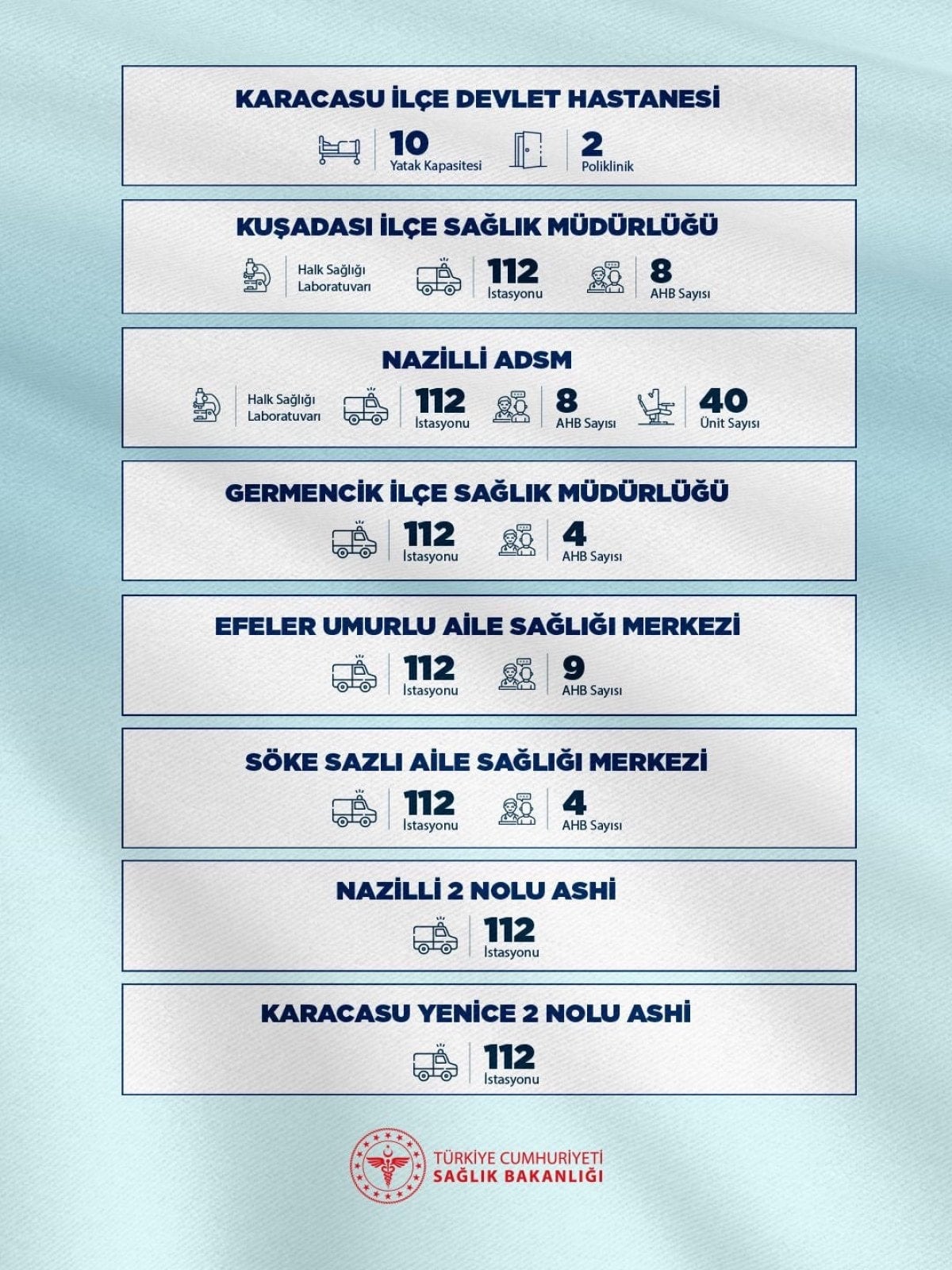Sağlık Bakanlığı, sosyal medya üzerinden “Aydın’ımızın sağlık hizmeti kapasitesini önemli ölçüde artıracak 11 yeni sağlık tesisimiz, vatandaşlarımızın şifası için kapılarını açıyor.” notuyla yaptığı paylaşımda tesislerin kapasite ve cihaz sayısı gibi detaylarını aktardı: