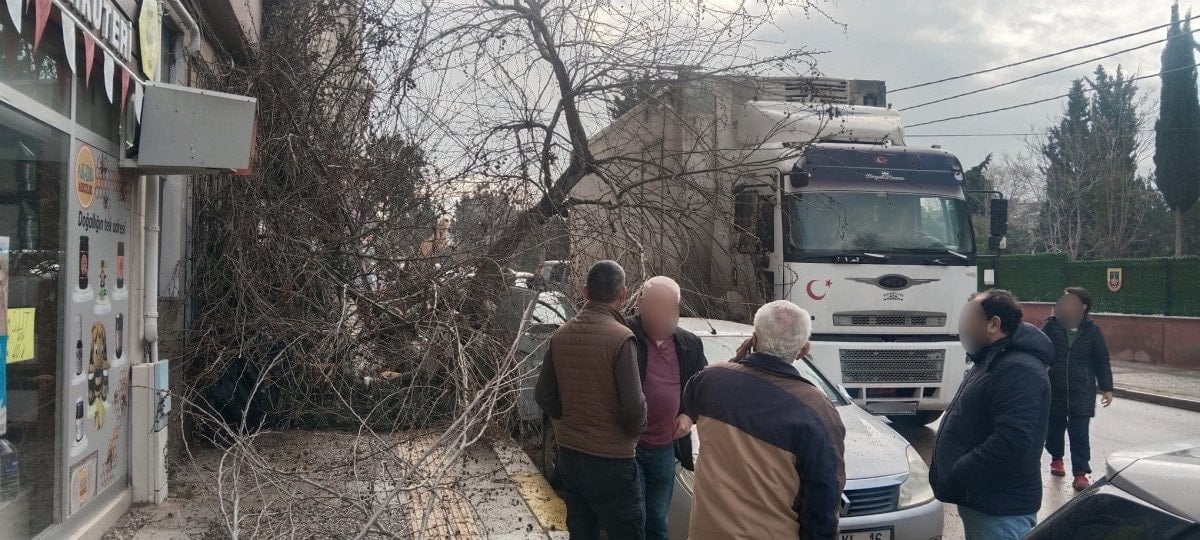 Balıkesir’de kamyonun çarptığı çınar ağacı, araçların üzerine devrildi