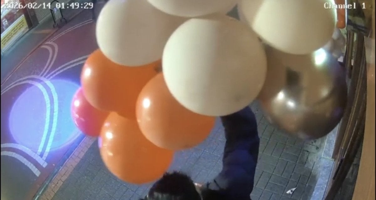 Bir tane balon alan şüpheli diğer balonları da üzerinde zıplayarak patlatırken, o anlar iş yerinin güvenlik kamerasına yansıdı.
