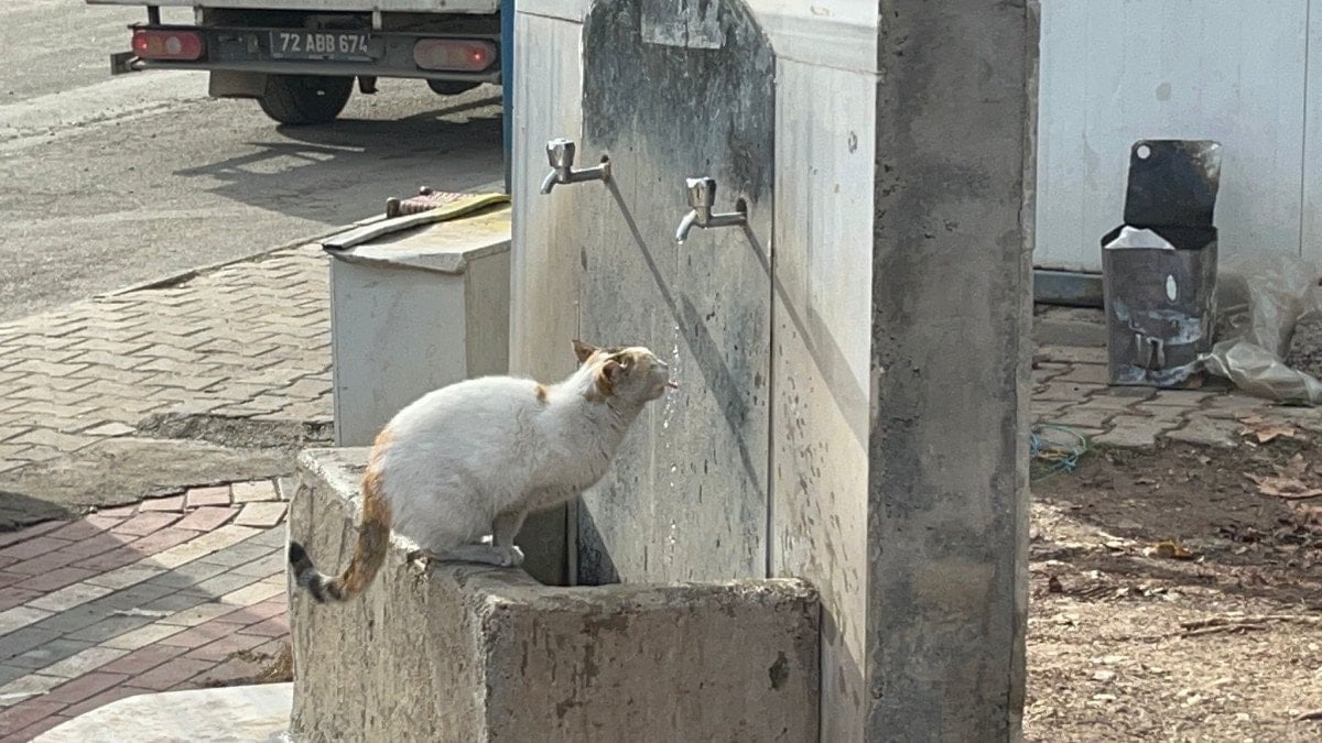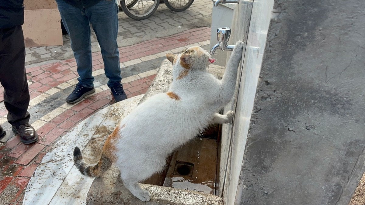 Kedinin susuz kaldığını fark eden vatandaşlar, çeşmenin musluğunu açtı. Bir patisiyle musluğu kavrayan kedi, dakikalarca kana kana su içti. O anlar çevrede bulunanlar tarafından ilgiyle izlendi.