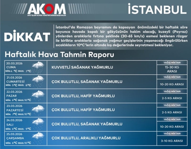 İstanbul Büyükşehir Belediyesi Afet Koordinasyon Merkezi’nden yapılan açıklamada kentte Ramazan Bayramı’nı da kapsayan bir haftalık süre boyunca kapalı bir gökyüzünün hakim olacağı kaydedildi.