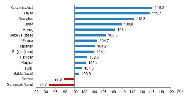 Sebze ürünleri toplamı için 2024-2025 piyasa döneminde yurt içi üretimin, yurt içi talebi karşılama derecesi %108,8 oldu. Sebzelerde en yüksek yeterlilik dereceleri sakız kabakta %116,2, hıyarda %115,7, domateste ise %112,3 olarak gerçekleşti.