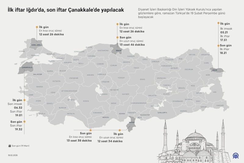 Ramazanın ilk günü en erken imsak Iğdır’da saat 05.21’de okunacak. İlk iftar da yine Iğdır’da saat 17.51’de yapılacak.