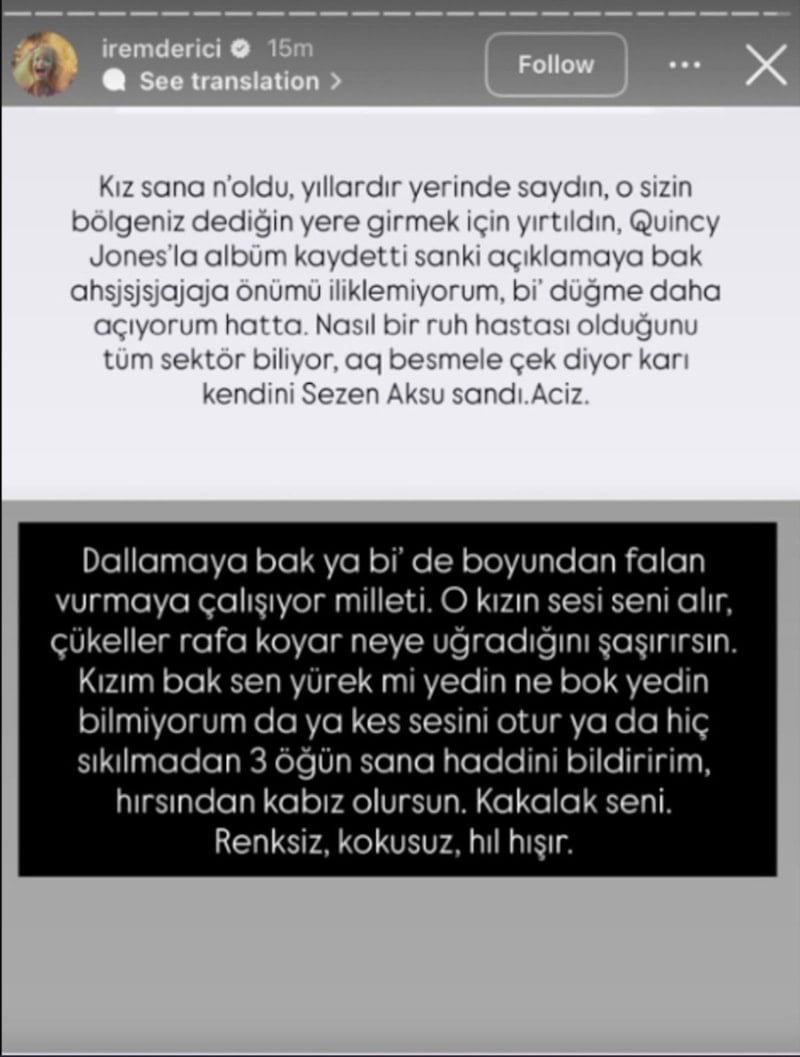 “Kız sana n’oldu? Yıllardır yerinde saydın, o sizin bölgeniz dediğin yere girmek için yırtıldın. Quincy Jones’la albüm kaydetti sanki açıklamaya bak. Önümü iliklemiyorum, bir düğme daha açıyorum hatta. Dallamaya bak ya bi’ de boyundan falan vurmaya çalışıyor milleti. Kızım bak sen yürek mi yedin ne b*k yedin bilmiyorum da ya kes sesini otur ya da hiç sıkılmadan 3 öğün sana haddini bildiririm, hırsından kabız olursun. Kakalak seni.’