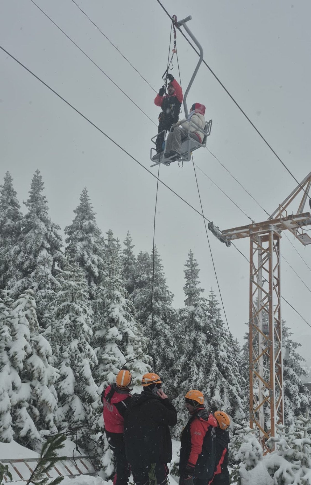 Başlatılan tahliye işlemlerinde halatlar yardımıyla havada kayaklarıyla asılı kalan tatilciler, aşağıya sağlıklı olarak indirildi.