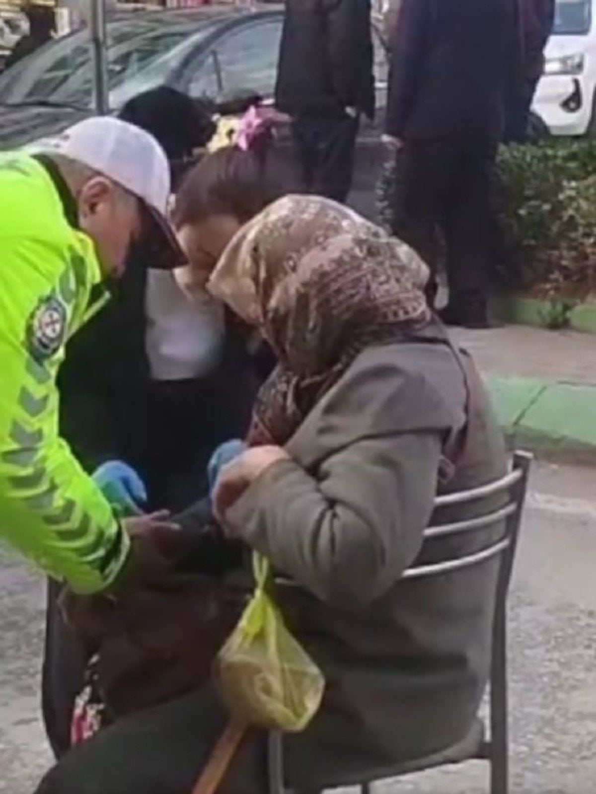 Hafif yaralanan kadın, çevredeki esnaf tarafından verilen bir sandalyede oturarak sağlık ekiplerinin gelmesini bekledi.