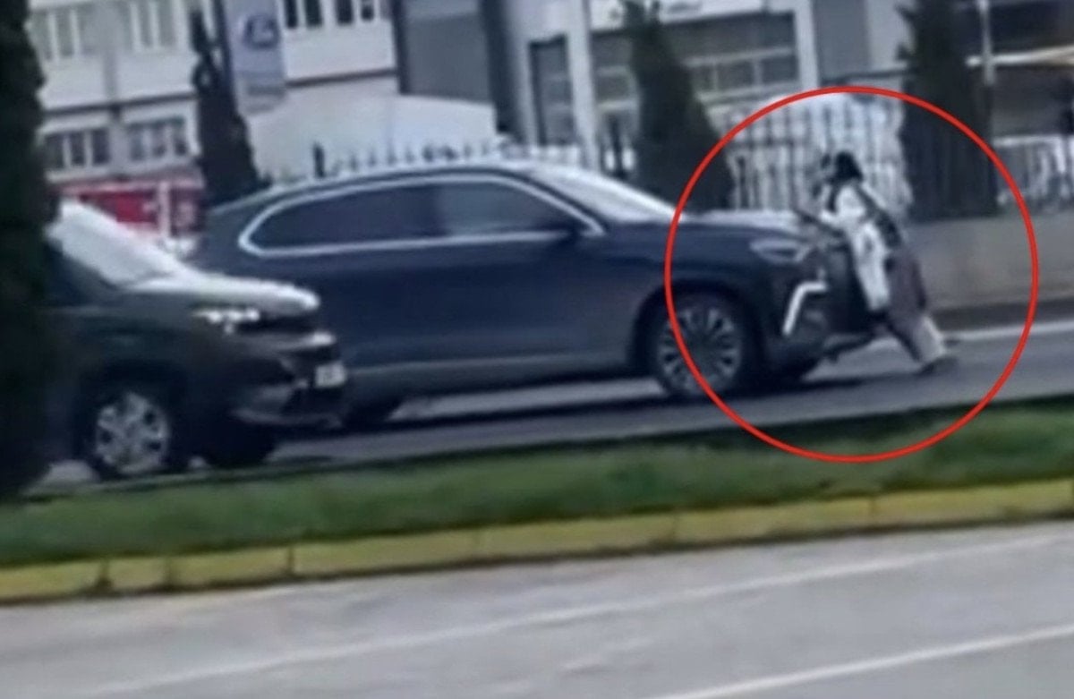 Kadının yolu kapatması nedeniyle caddede kısa sürede uzun araç kuyrukları oluşurken, sürücüler korna çalarak tepki gösterdi.