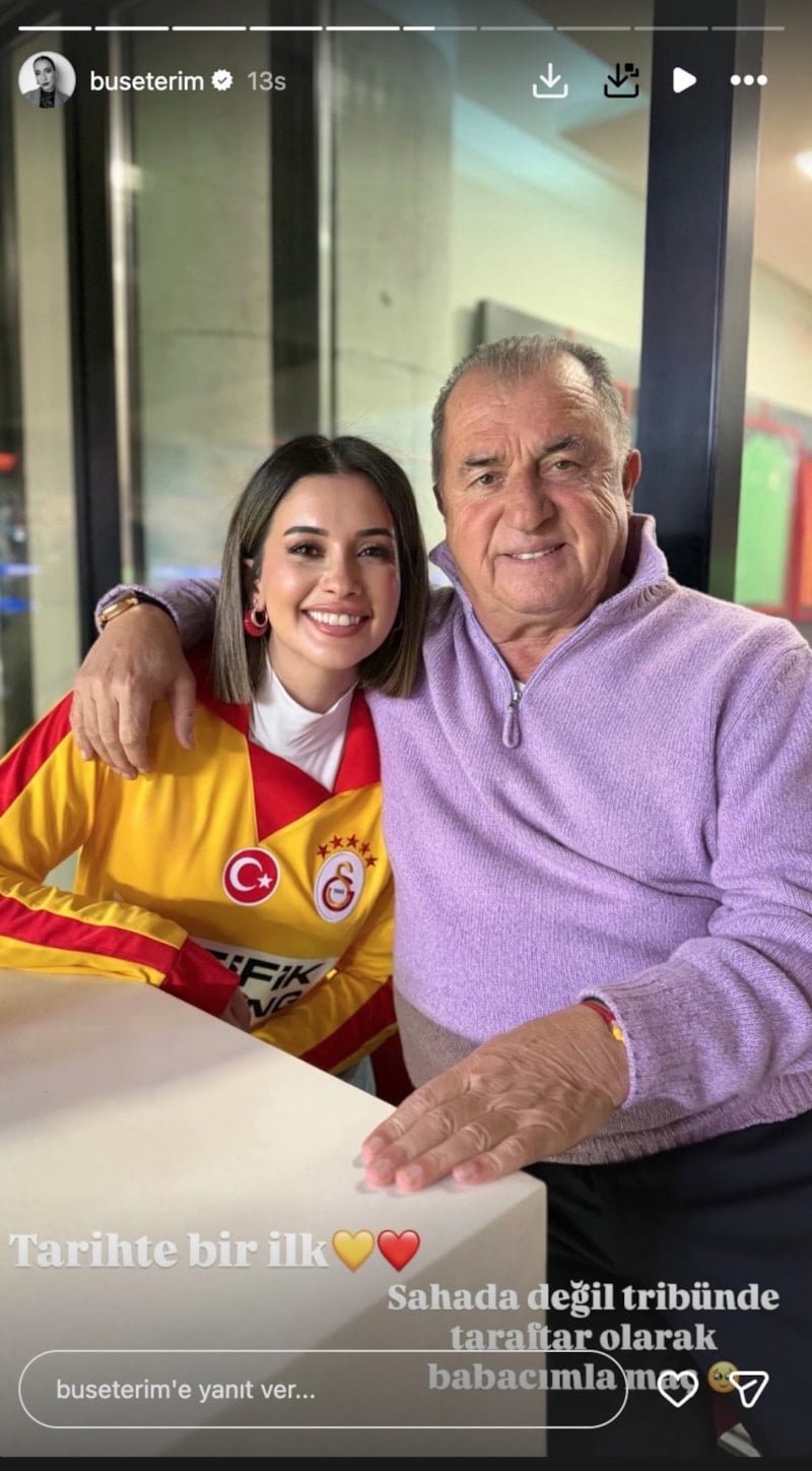 Terim’in fenomen olan küçük kızı Buse Terim, babasıyla birlikte çekildiği kareyi Instagram hesabından paylaşarak, “Tarihte bir ilk! Sahada değil, tribünde taraftar olarak babacımla maç keyfi” notunu düştü.