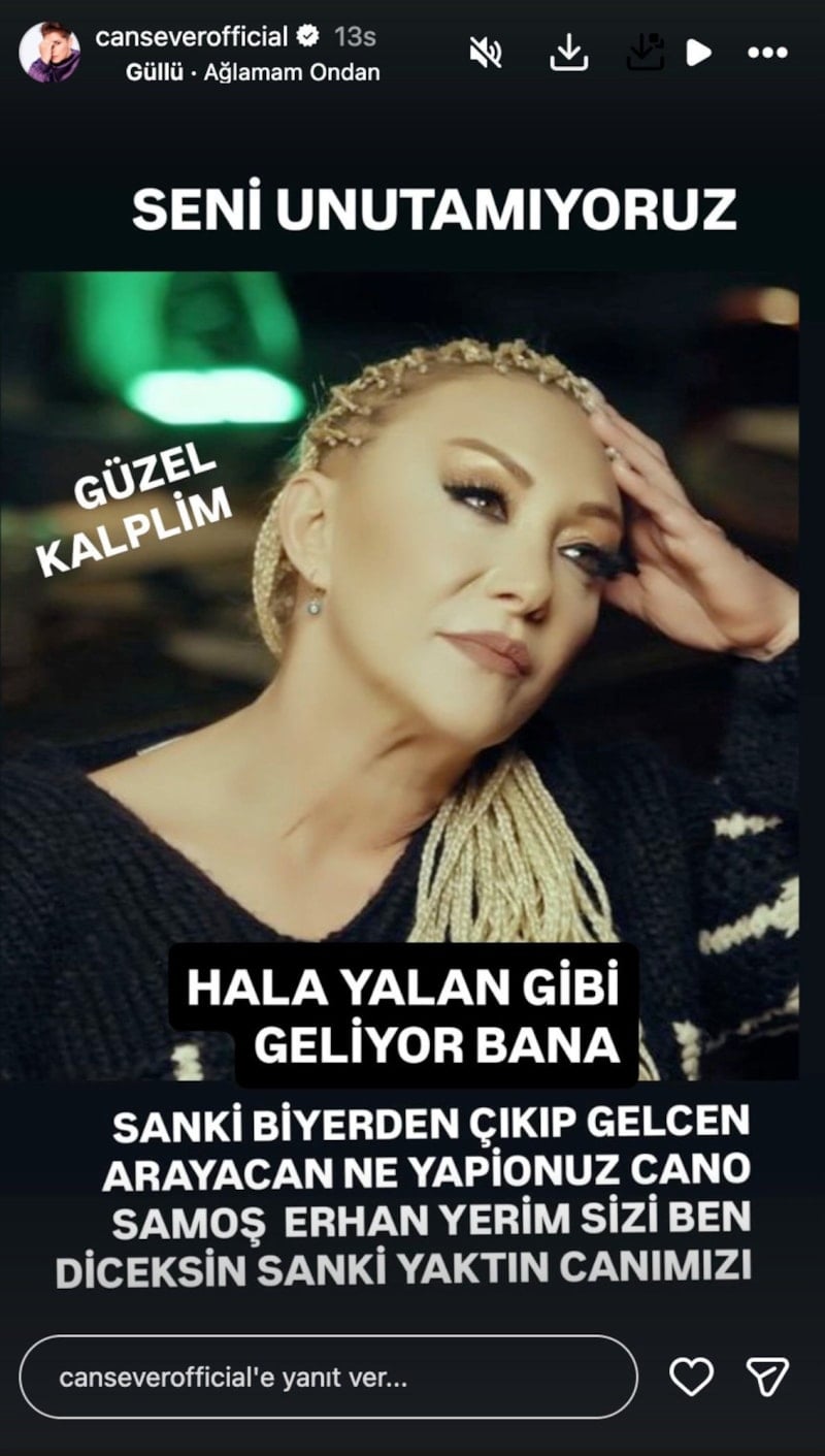 Güllü’nün fotoğrafını paylaşan Cansever, “Seni unutamıyoruz. Güzel kalplim… Hala yalan gibi geliyor bana. Sanki bir yerde çıkıp geleceksin, arayacaksın ‘ne yapıyorsun cano Samoş, Erhan yerim sizi ben’ diyeceksin sanki. Yaktın canımızı” ifadelerini kullandı.