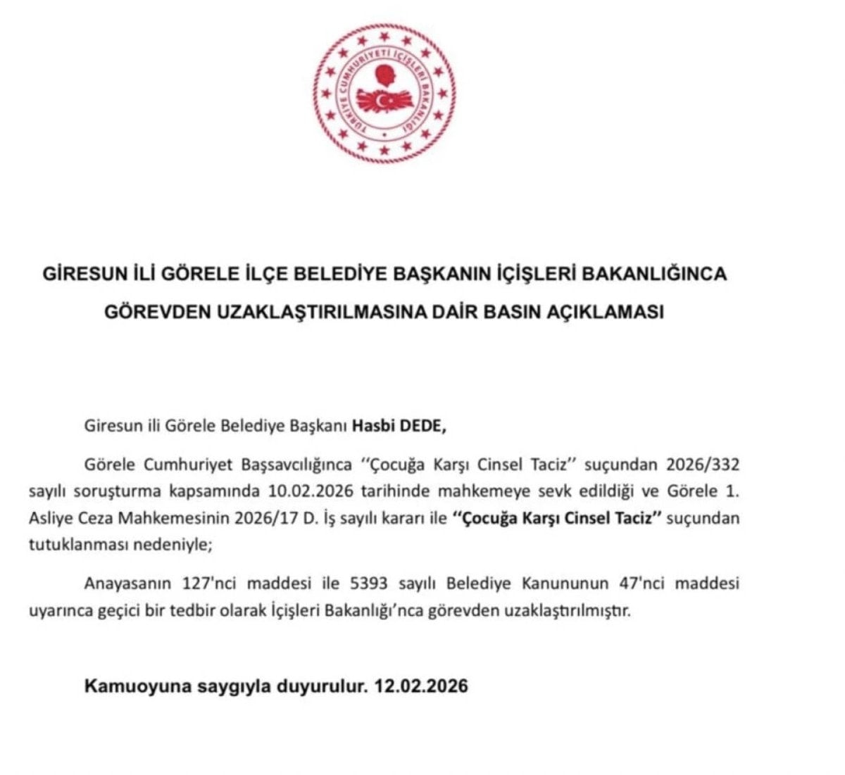 Giresun’un Görele Belediye Başkanı Hasbi Dede, “çocuğa karşı cinsel taciz” suçundan tutuklandı.
