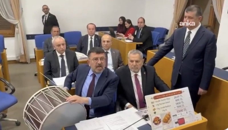 “Ramazan ayındayız. Bu davulun sesini duyun. Bu davul emeklinin davulu.” diyen Ağbaba, Meclis’te dakikalarca davul çaldı.