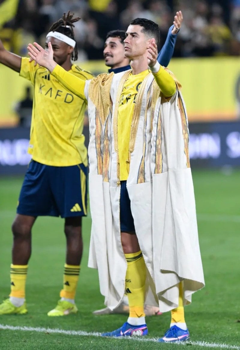 Portekizli yıldız, 22 Şubat Suudi Arabistan’ın kuruluş günü dolayısıyla maç sonunda ülkenin geleneksel kıyafeti olan “bisht”i giyerek taraftarları selamladı.