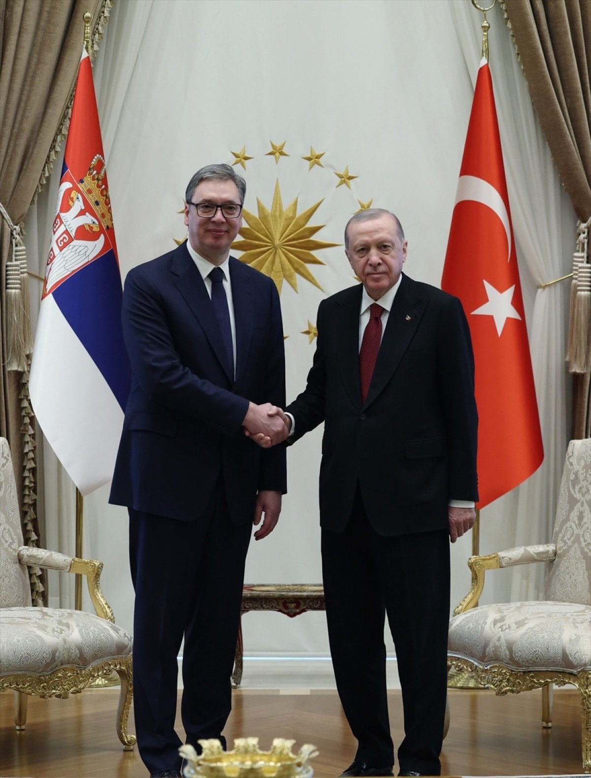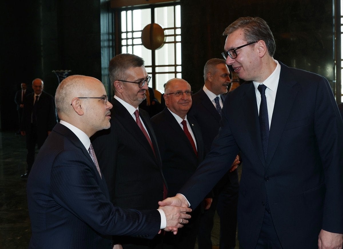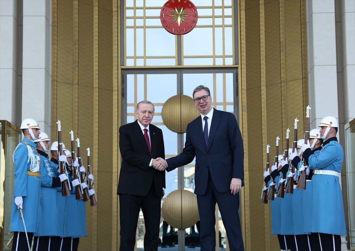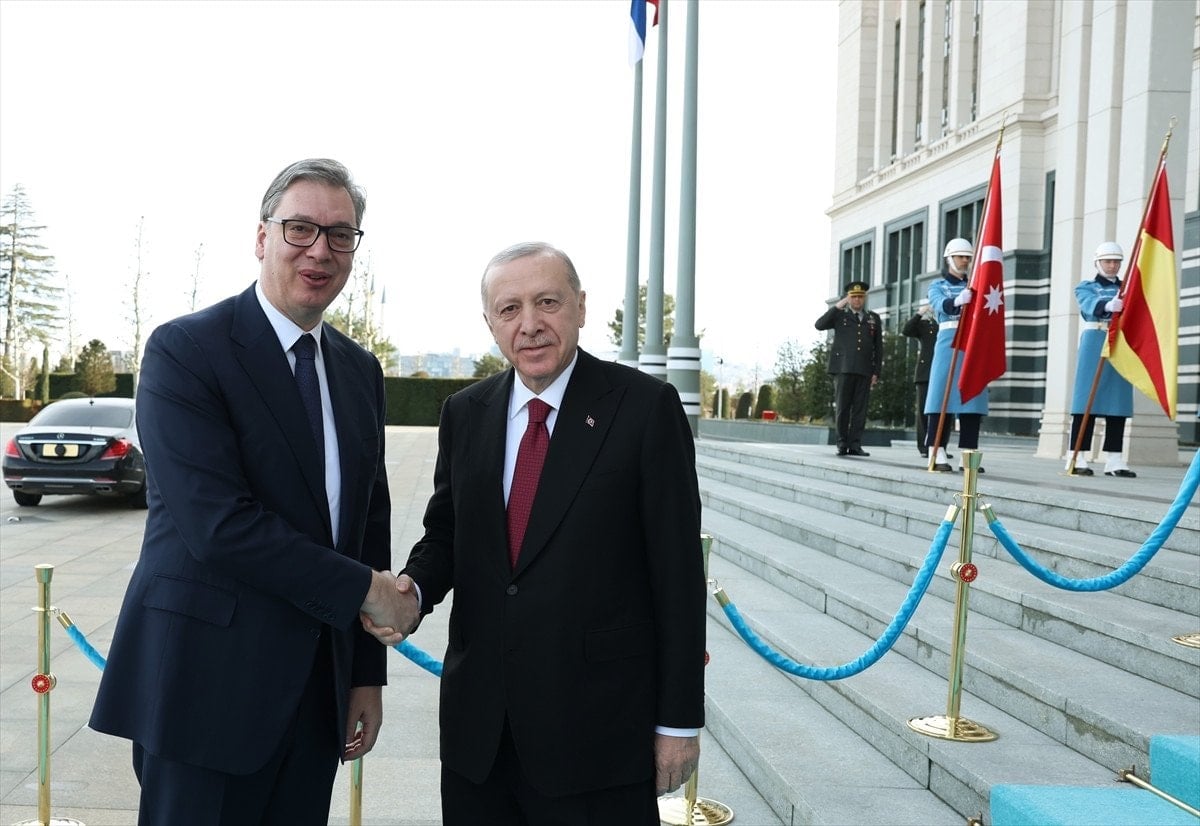 Sırbistan Cumhurbaşkanı Aleksandar Vucic, Ankara’daki temasları kapsamında Cumhurbaşkanlığı Külliyesi’nde düzenlenen resmi törenle karşılandı. Törenin ardından Erdoğan ve Vucic baş başa görüşmeye geçti.