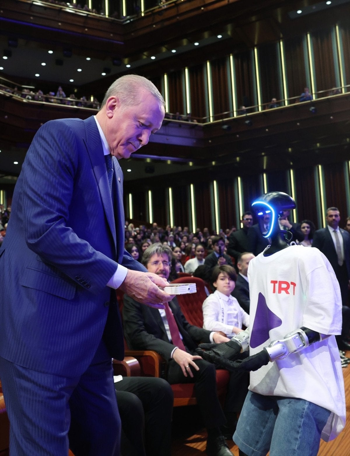 Burada tamamı Türk mühendisleri tarafından yapılan Robogenç’ isimli robot, Cumhurbaşkanı Erdoğan’a TRT Genç Kanalı’nın kumandasını getirdi.