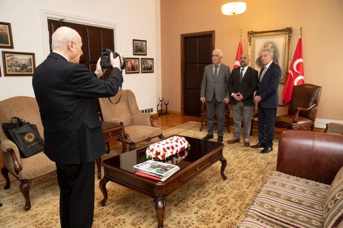 Öte yandan görüşmeye ilişkin paylaşılan fotoğraflarda Bahçeli’nin fotoğraf makinesini eline alarak heyetin fotoğrafını çektiği görüldü.