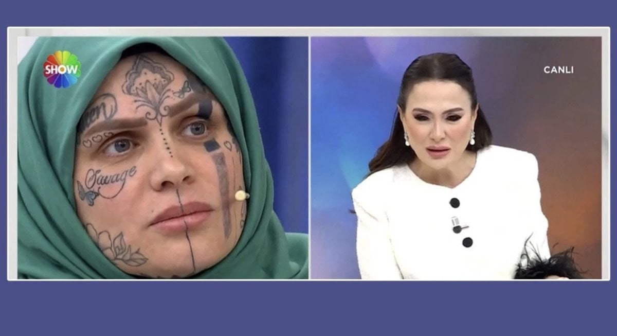 Mağdur kadın stüdyoya girdiği anda programın sunucusu Didem Arslan’ın dikkatini kadının yüzündeki dövmeler çekti.