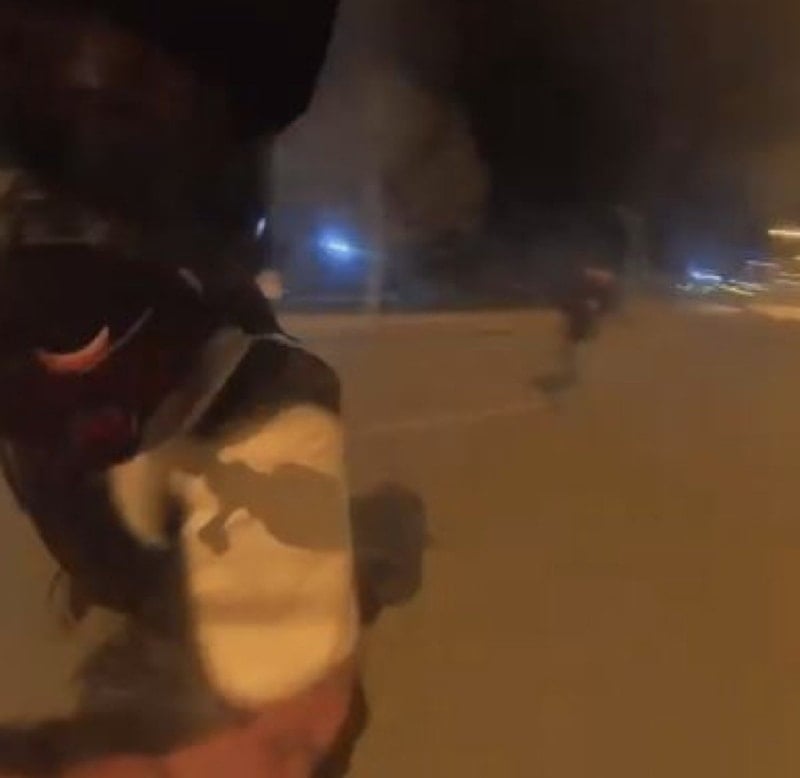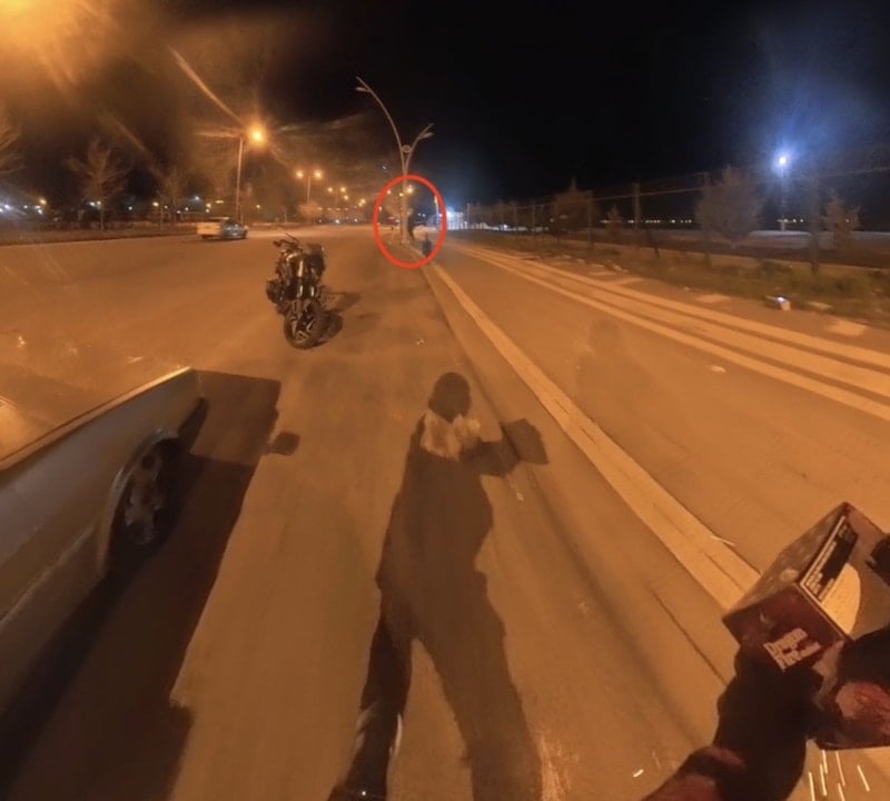 Sürücünün paylaştığı görüntülerde havai fişeğin ateşlenmesiyle gençlerin panikle kaçıştığı, ardından yapılan şakadan hoşlanmayan bir kişinin motosikletliyi kovaladığı görüldü.