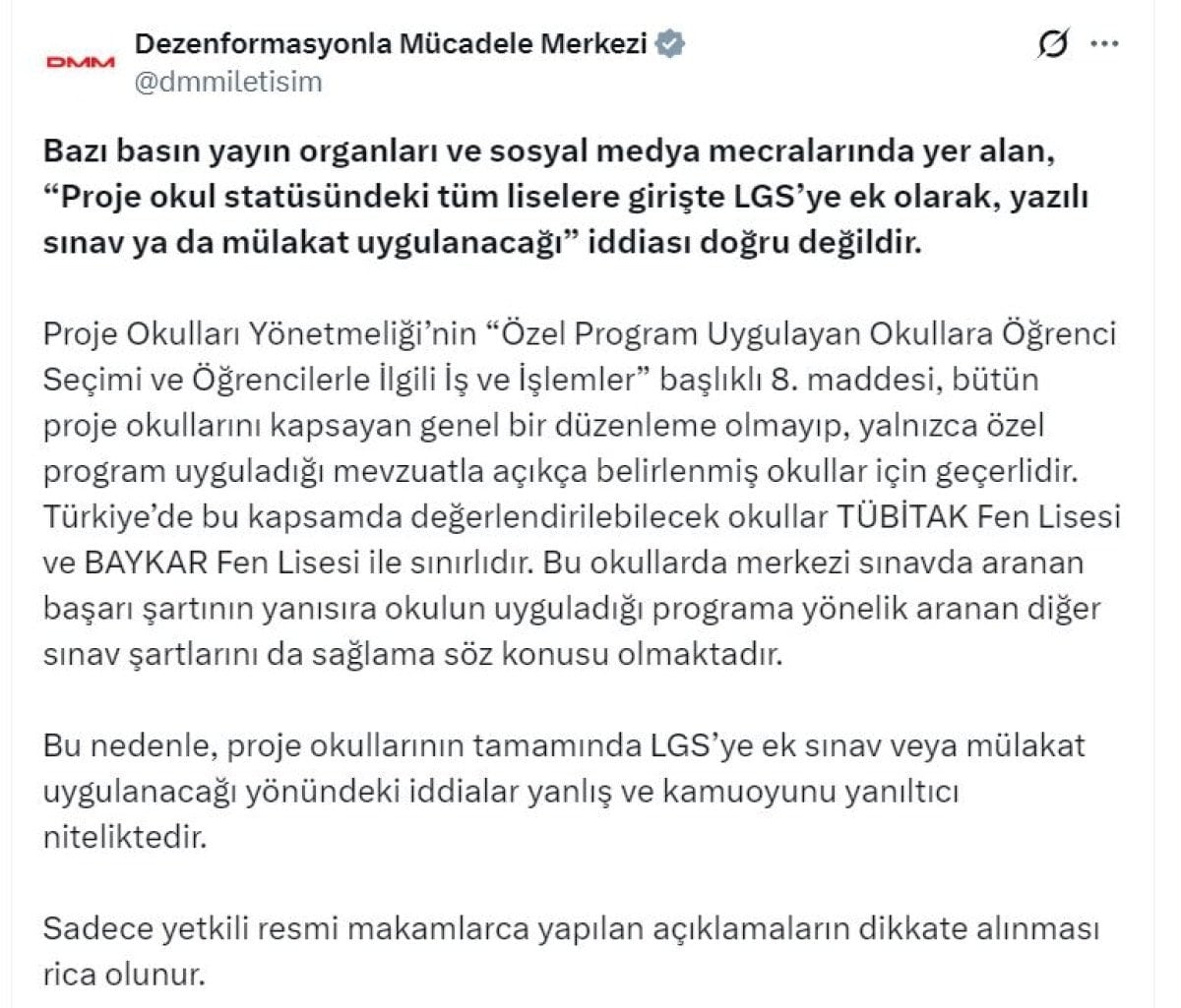 DMM, proje okullarının tamamında LGS’ye ek sınav veya mülakat uygulanacağı yönündeki haber ve paylaşımların dezenformasyon niteliği taşıdığını belirterek, yalnızca yetkili resmi makamların açıklamalarının dikkate alınması çağrısında bulundu.