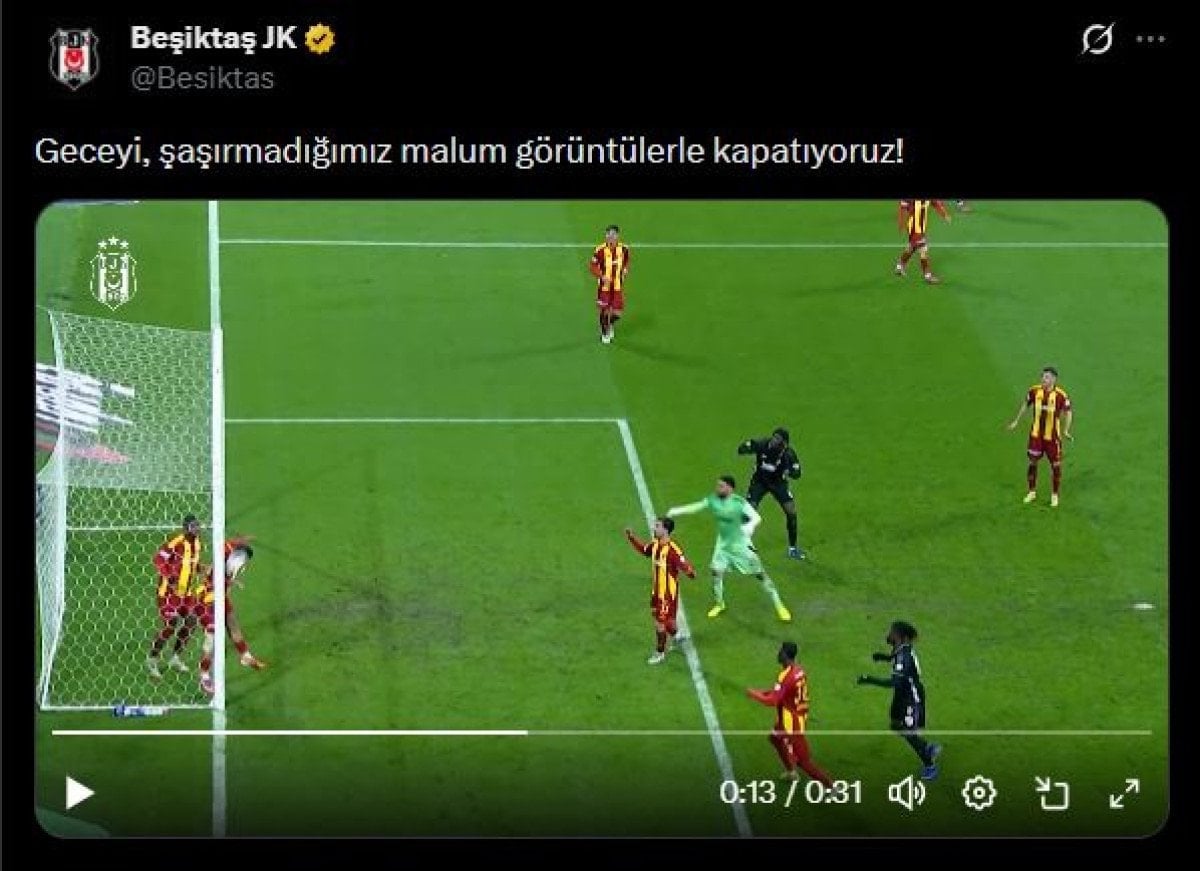 Karşılaşmanın ardından Beşiktaş’ın resmi X hesabından söz konusu pozisyona ilişkin dikkat çeken bir paylaşım yapıldı. Siyah-beyazlı kulüp, görüntüyü “Geceyi, şaşırmadığımız malum görüntülerle kapatıyoruz!” notuyla yayımladı.