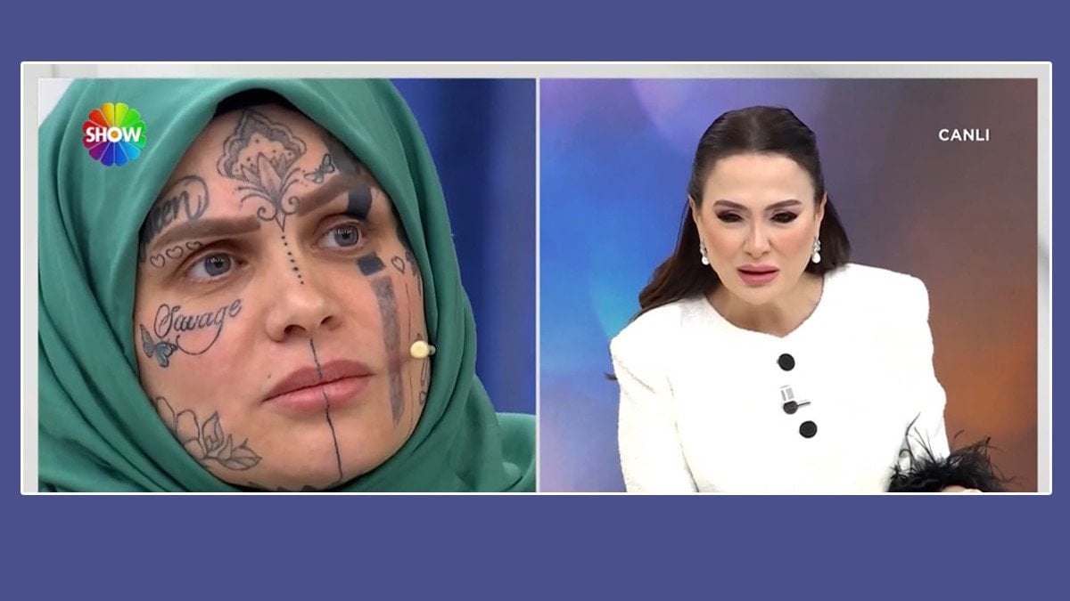 Mağdur kadın stüdyoya girdiği anda programın sunucusu Didem Arslan’ın dikkatini kadının yüzündeki dövmeler çekti.
