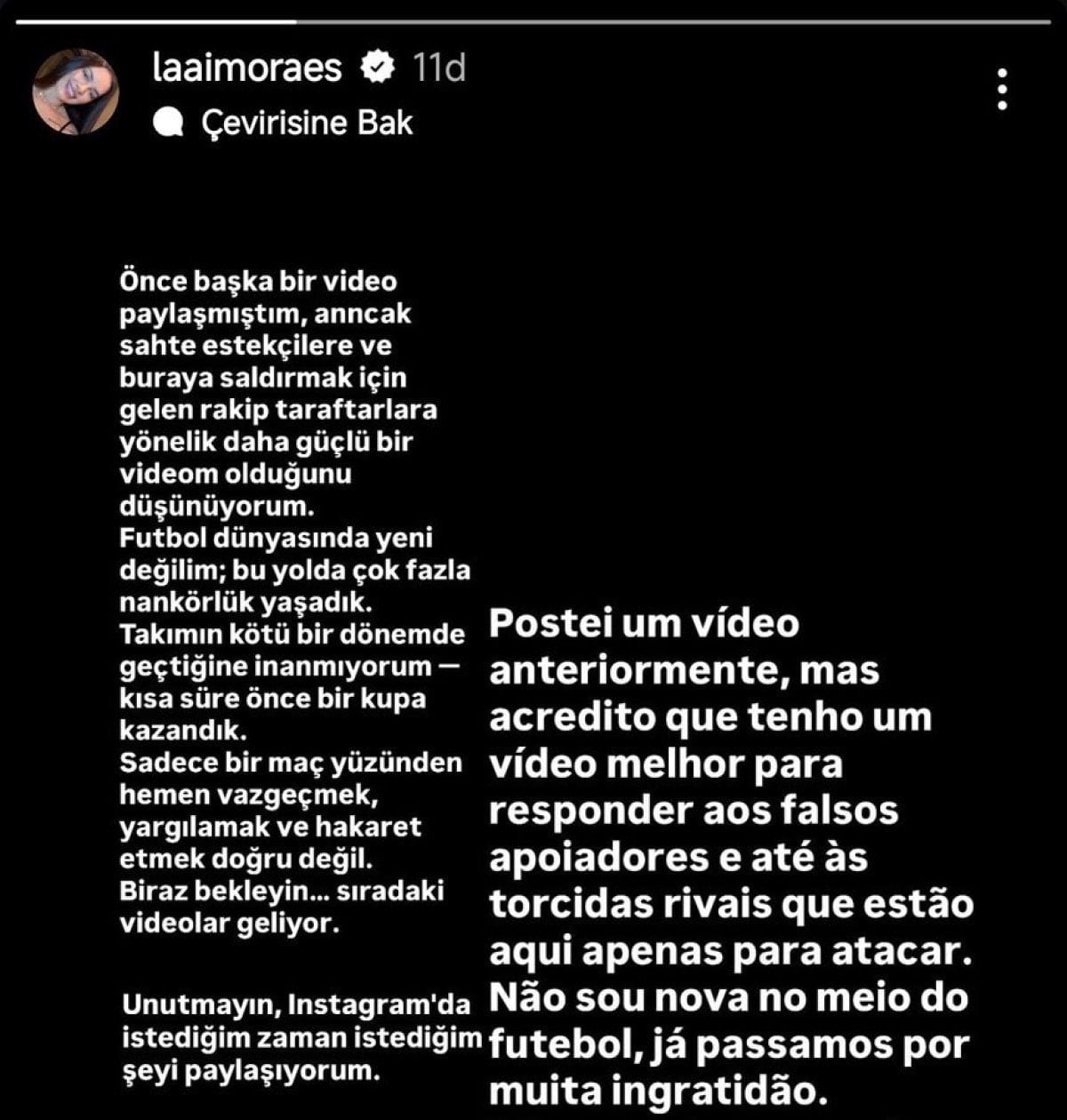Sosyal medya hesabından tepkilere ve olumsuz yorumlara yanıt veren Lais Moraes, sarı-lacivertli taraftarları moralli olmaya çağırdı.