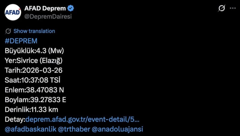 Son olarak Afet ve Acil Durum Yönetimi Başkanlığı (AFAD) Elazığ’da bir depremin meydana geldiğini aktardı.