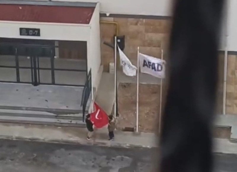 Soğuk havaya ve yorgunluğa aldırış etmeyen küçükler, bayrağın yeniden düşmemesi için dakikalarca nöbet tuttu.