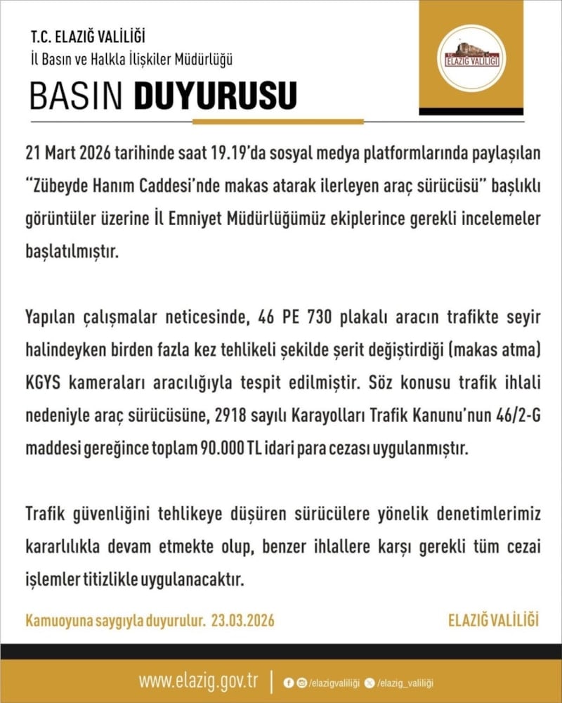 Denetimlerin kararlılıkla süreceğini açıklayan Elazığ Valiliği, “21 Mart 2026 tarihinde saat 19.19’da sosyal medya platformlarında paylaşılan ‘Zübeyde Hanım Caddesi’nde makas atarak ilerleyen araç sürücüsü’ başlıklı görüntüler üzerine İl Emniyet Müdürlüğümüz ekipleri tarafından gerekli incelemeler başlatılmıştır.