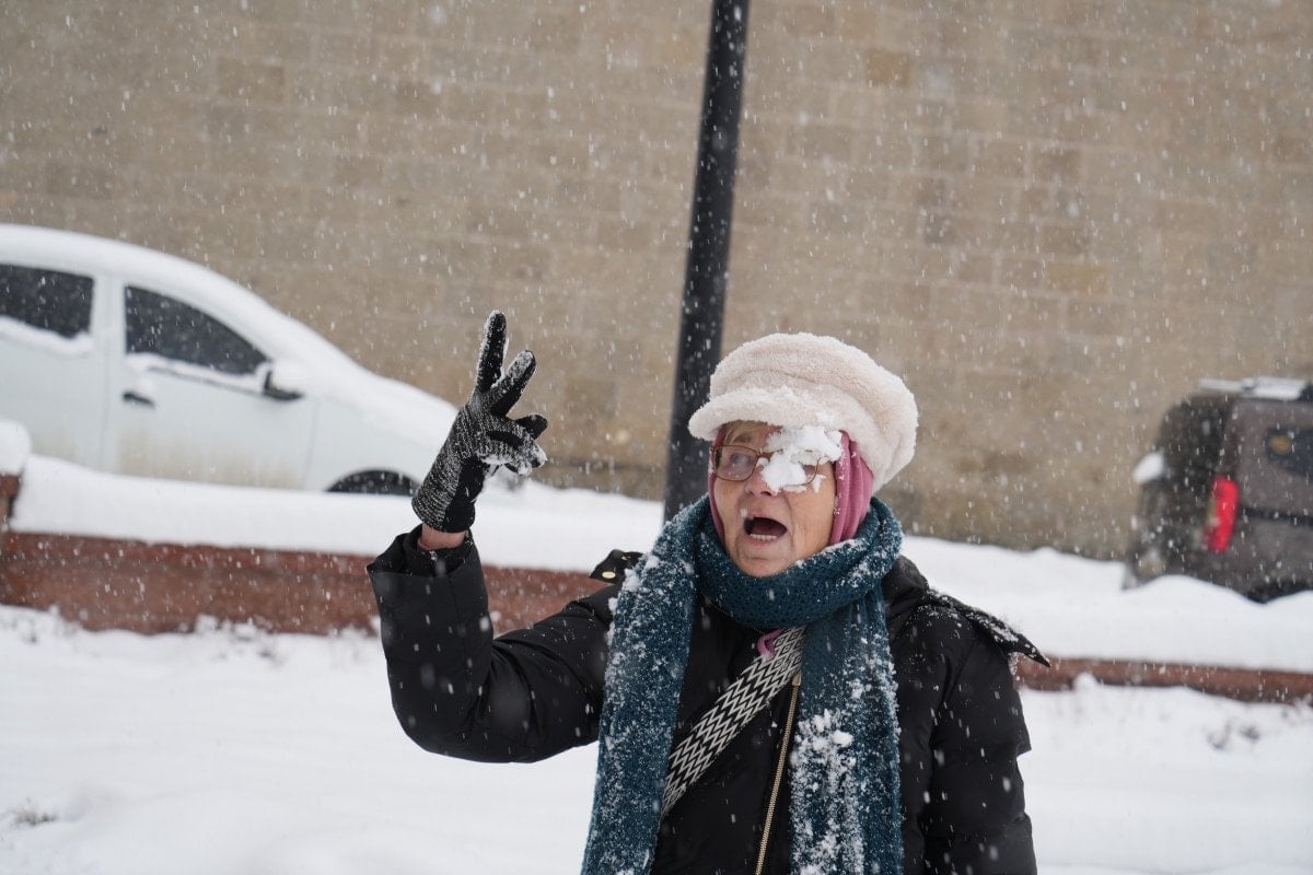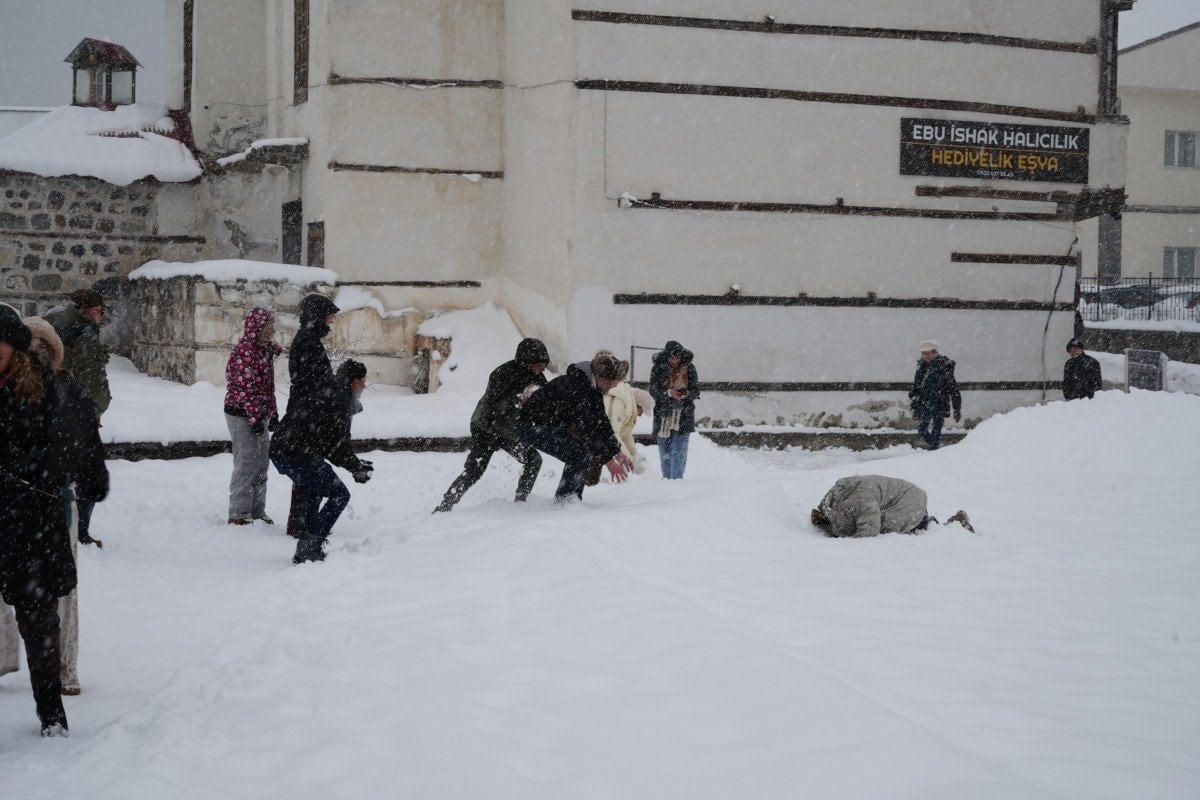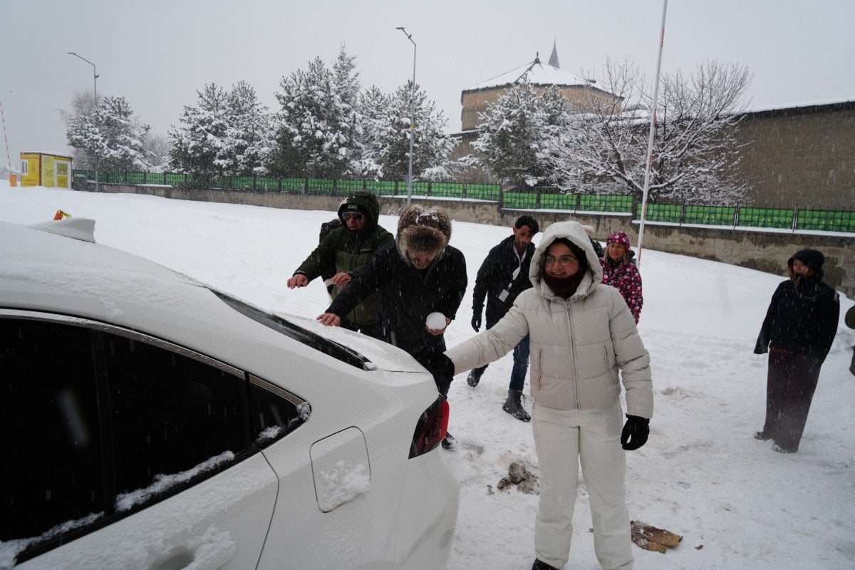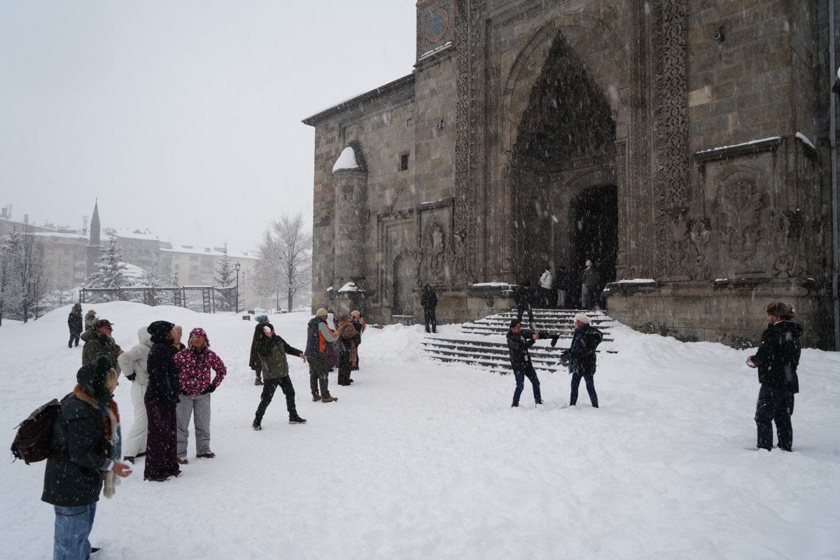 Turistler, kentin simge yapılarından Çifte Minareli Medrese’yi ziyaret ederek hem tarihi atmosferi deneyimledi hem de kar altında kartopu savaşı yaptı.
