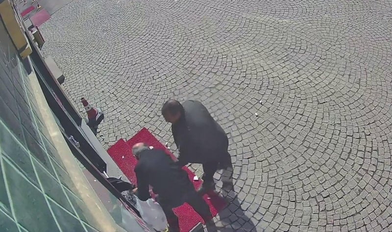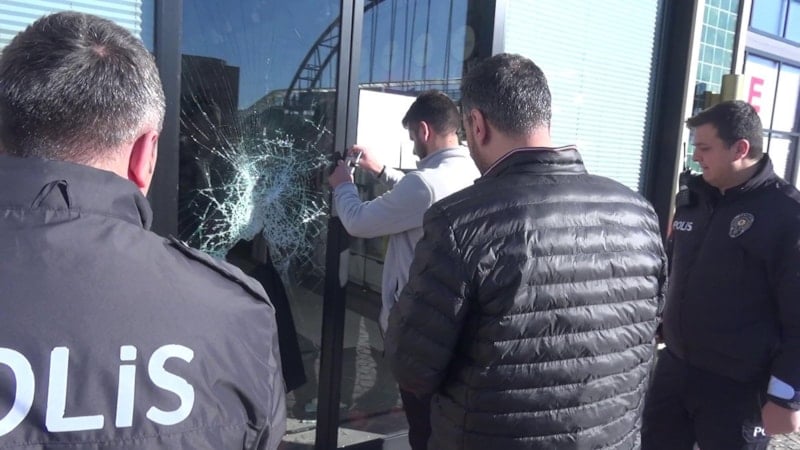Yanında getirdiği mermer parçasını defalarca iş yerinin camına atan kişi, daha sonra yerden bulduğu parke taşını da art arda fırlattı.