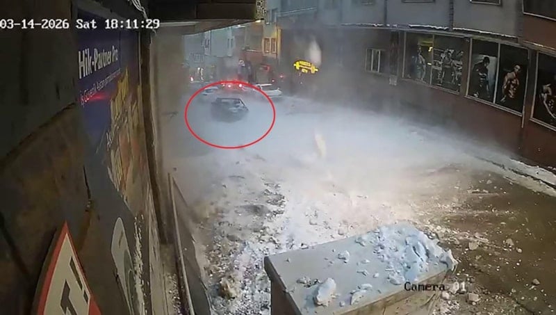 Olay anı, yakınlardaki bir iş yerinin güvenlik kamerası tarafından kaydedildi. Görüntülerde, çatıda biriken karın bir anda otomobilin üzerine düştüğü an net şekilde görülüyor.